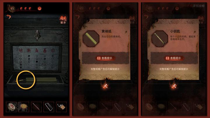 游戏完成,机关打开,拾取【黄裱纸】和【小钥匙】