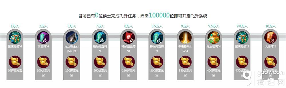 需要有10万名玩家完成飞升任务才能开启,而每一个完成阶段大家都会获得一定的绑定元宝和奖励,具体如下图所示: