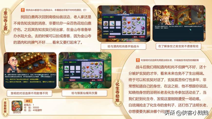 剧情开始:南极仙翁 →白鹿精[战]→玉面狐狸[战]→南极仙翁[给百色花]→酒肉和尚[给香][战]→慧明[剧情分支] →