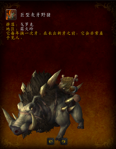 在【霜火岭】地图,由稀有精英【戈罗克】掉落·德拉诺猪十二,之一的(巨型灰牙野猪)坐骑