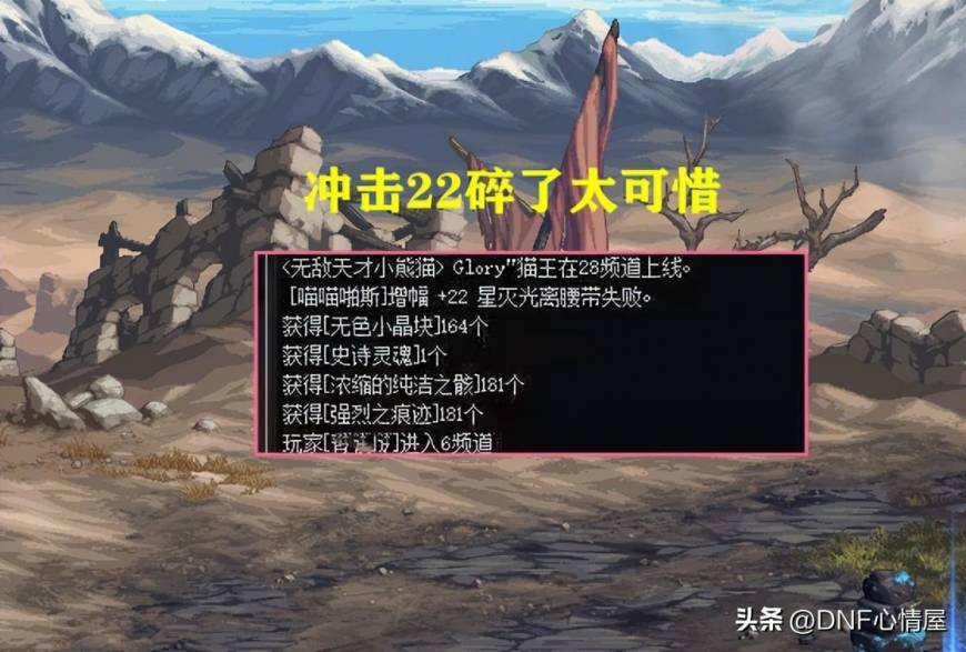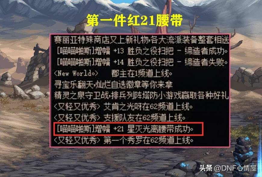 4月初的时候,在阿拉德大陆上,诞生出一件红21腰带,整个服务器独一无二。但即便这么高增幅的腰带,也没能挽留住对方,还是冲击22失败了,碎成一堆材料。
