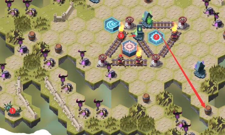 1号把2号的太阳石柱降下来,3号开炮通过传送门打掉挡路的木桶