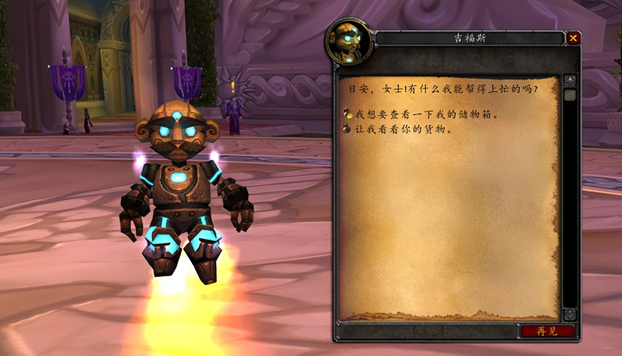 4.基维斯,该道具的应该是魔兽世界最实用的道具,没有之一,即便是正式服的魔兽玩家还依旧在用,效果是召唤一个机器人管家,所有队伍里的玩家都能与其交互并修理装备,工程学专业的玩家还可以利用基维斯远程访问主城银行背包,工程学玩家再也不用担心背包满了的情况,因此也是未来WLK版本,工程学玩家人手必备的道具。