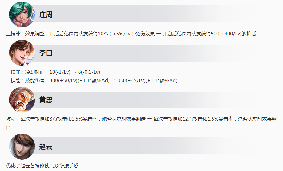 庄周平调:大招群体免伤调整为群体添加护盾,有利于保护后排脆皮。