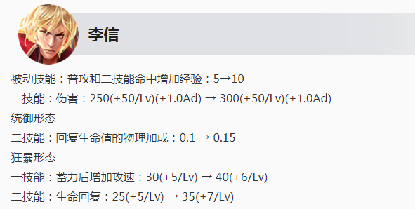 李信加强:4级前的2技能伤害增高,4级后的双形态2技能回血增多,狂暴形态下的1技能攻速增高。