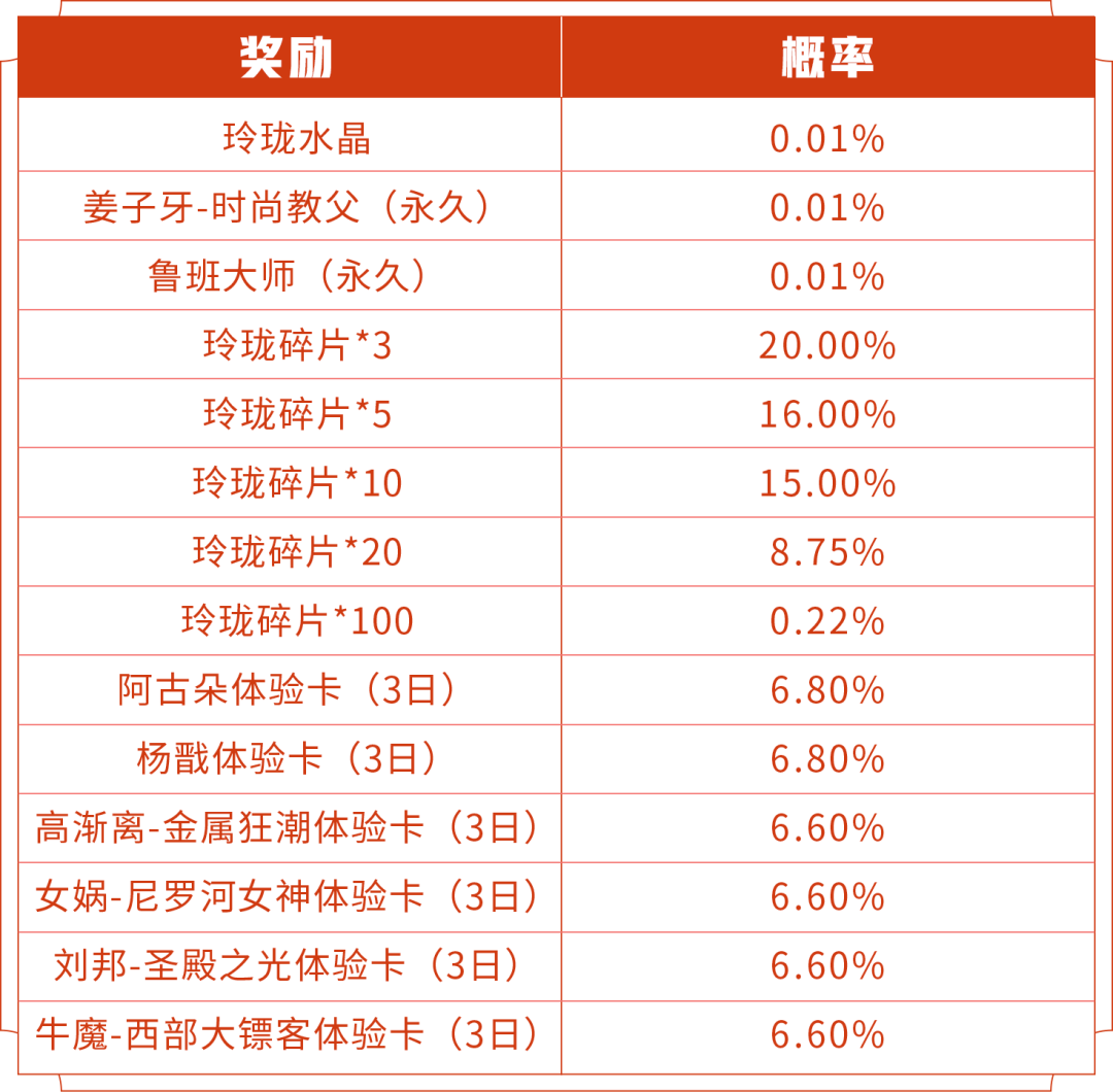 消耗一定量的金币或铭文碎片可进行玲玲夺宝,抽永久伴生皮肤时尚教父(姜子牙),其他奖励都是些体验卡、头像框、回城/击败特效、个性动作之类的。