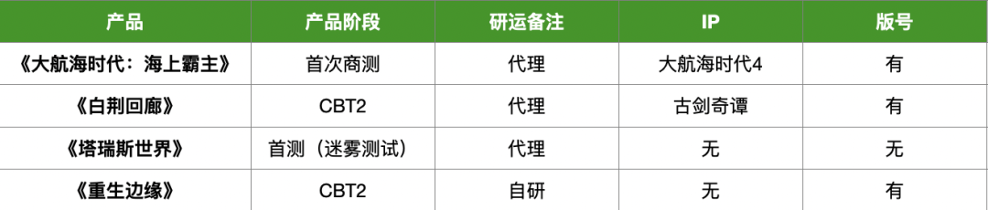 一方面,许多高投入产品正逐步完成研发,进入测试及收尾阶段。如完美世界游戏的《一拳超人:世界》、腾讯游戏《重生边缘》、巨人网络《原始征途》、创梦天地《卡拉彼丘》等产品。