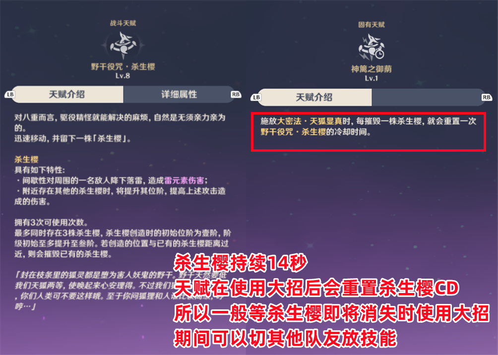 八重神子的技能机制不算复杂,对于初上手的小伙伴只需要记住三点:1.元素战技的杀生樱最多可以放三个,并且靠近放能让伤害更高;2.元素爆发会根据场上杀生樱的数量增加攻击段数,有三个杀生樱时伤害最高;3.每个杀生樱持续14秒,由于天赋可以重置CD,可以等杀生樱即将消失(期间切其他角色放技能)的时候再放大招。