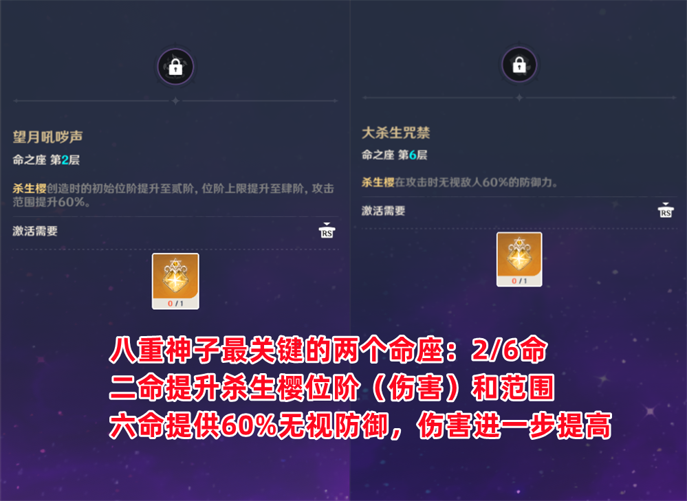 一命能在放元素爆发后最多恢复24点能量。二命是让杀生樱的位阶变高,同时攻击范围更广,对伤害和日常体验都有明显的提升。四命赋予了八重神子给全队增加20%雷伤的功能,适用于纯雷队。六命则是让杀生樱拥有了珍贵的无视60%防御力,伤害进一步提升。
