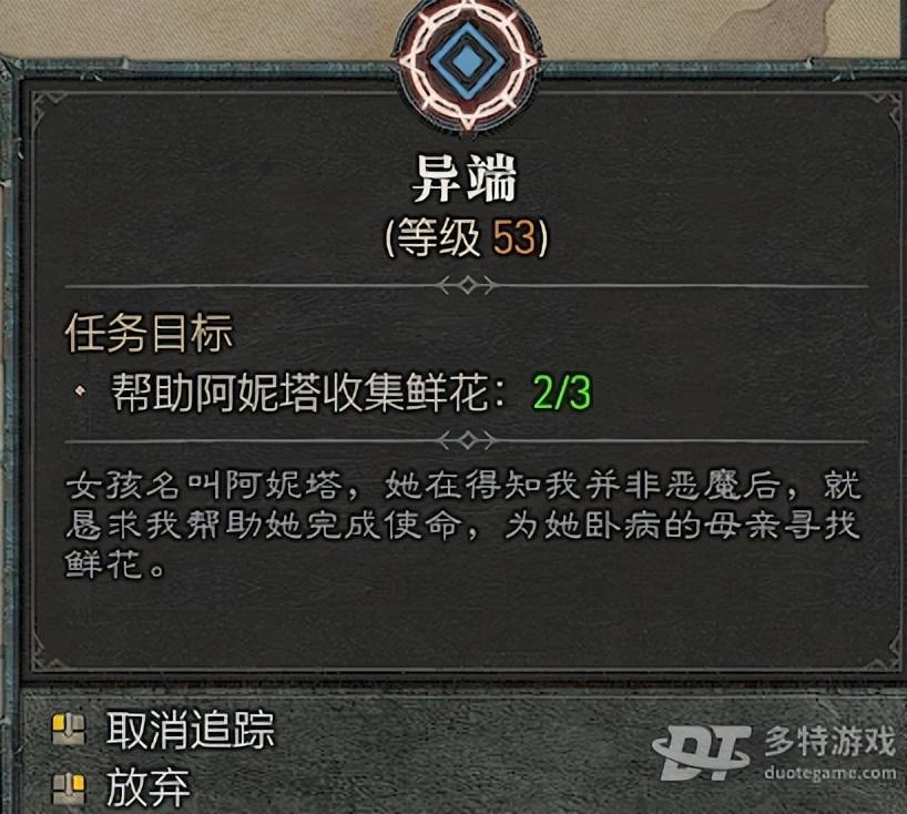 1、异端支线任务中玩家需要帮助阿妮塔收集鲜花三朵,任务等级为53级。