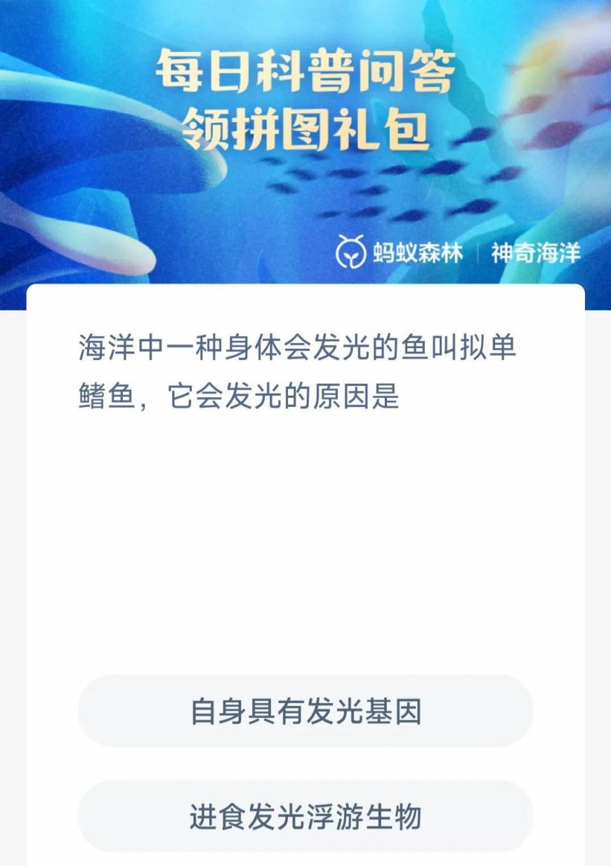 蚂蚁森林中海洋问的是:海洋中一种身体会发光的鱼叫拟单鳍鱼,它会发光的原因是?