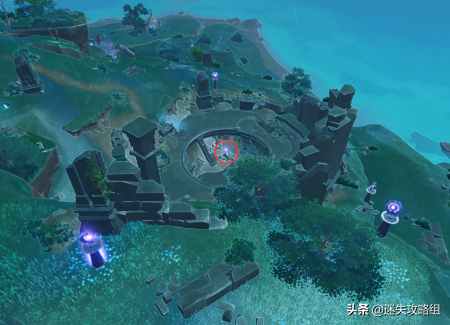 然后你顺着你背后的山坡爬到顶,你就又回到了这个鸣神磐柱的位置,顺着我的箭头的位置,我们去找珠子。(如果找不到位置,你就再开元素视野。反正就两个方向,一个是回到你刚才的地宫入口,一个是往大蓝色罩子的位置去。)