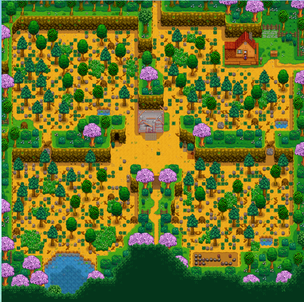 非常标准的地图,没什么特色就是最大的特色,宽广的可耕种面积,种多少地,养多少动物都不在话下,没什么障碍物也是特别好规划的一块地图。