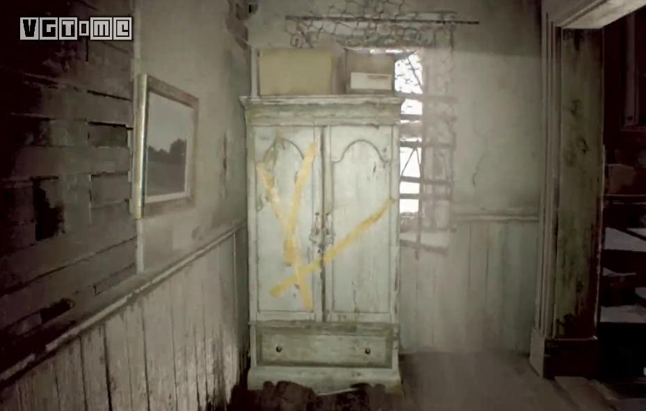 退回上一个房间向里走,在柜子下面可以找到燃烧器燃料,开门后的场景就是“米娅”录像带中解谜的地方,先记住这里。接着打开大门,在门外取得燃烧器把手,小屋内还能找到增加道具栏上限的背包。