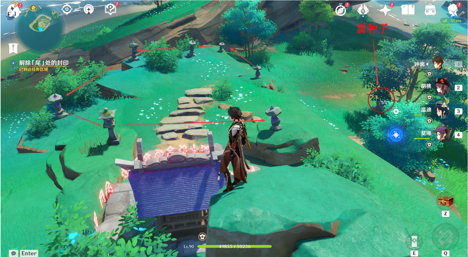 (2)解除「尾」处的封印,解除方法:拿雷种子然后跑到各个电灯笼前面点亮它们即可,要在一定时间内点亮所有灯笼,中间不能拖太久,