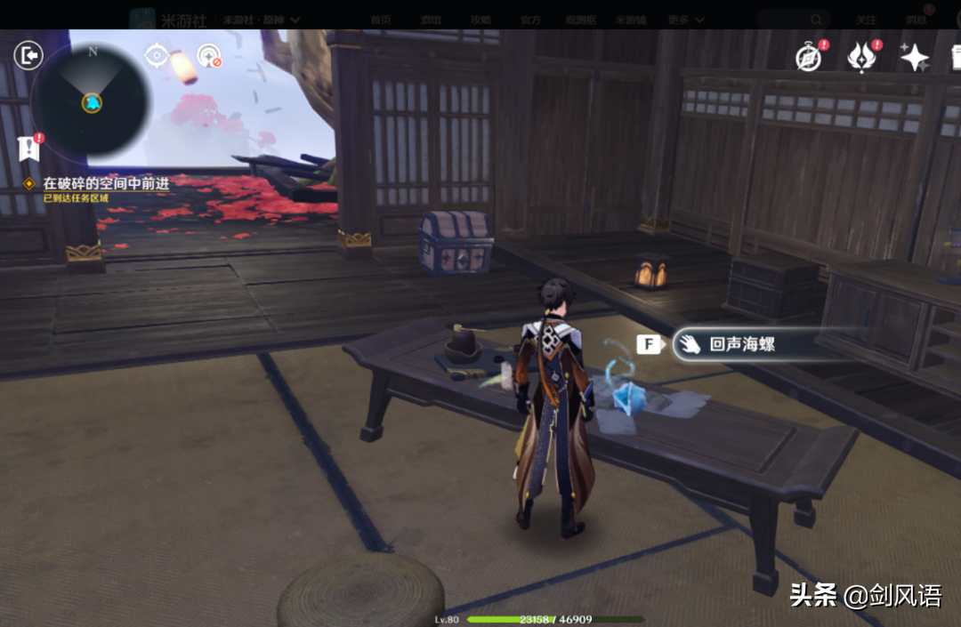 第15个海螺,在万叶秘境里面,【春庭景如旧·其三】桌子上。还没有拿到回声海螺的朋友,下面介绍方法重新进去拿。