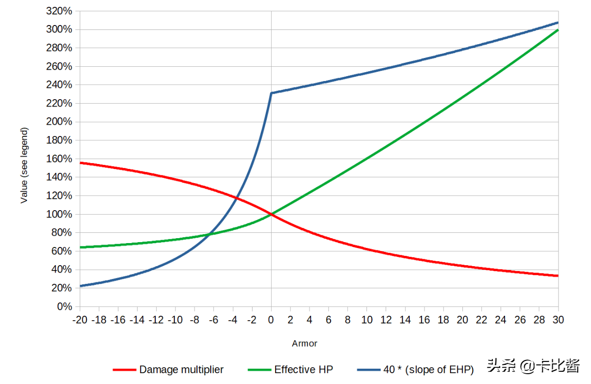 从图上可以看出,蓝线即护甲效率(提升或降低x点甲对有效HP的影响),负甲下随减甲越多减甲效益越差,减0-6点甲的性价比非常高。酱油中后期护甲通常也只有5-10点,暗灭对攻击力的加成是有着显著提升的。但相对来说,随着后期中立物品越多酱油针对性出装越强,减甲效益也会越来越差。所以,如果要出暗灭则尽早出。