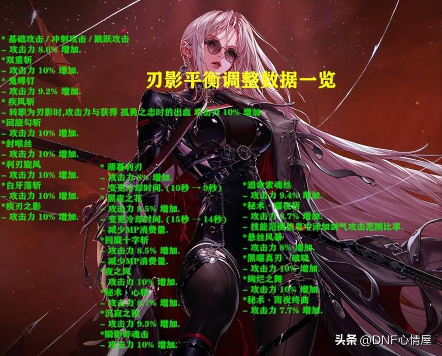 女鬼剑士刃影,这一次数值加强约9%,薄暮利刃和黑夜之花CD减少1秒,“耀夜斩”添加了技能范围效果。