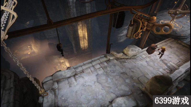 两兄弟各拽着一条铁链移动到前方的平台上落下,这嗰平台上有一个断裂爬梯,那么就让哥哥(按LT键)做好“垫脚石”的姿势,让弟弟走到哥哥面前(按RT键)踩着哥哥的手腕跳上平台。
