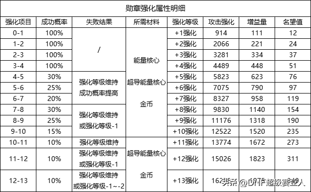 勋章升级:勋章总共有6个等级,每次升级到下个等级所需的材料都有所不同,这种升级阶段属于100%成功,此处所需16605个能量核心以及333个超导能量核心。