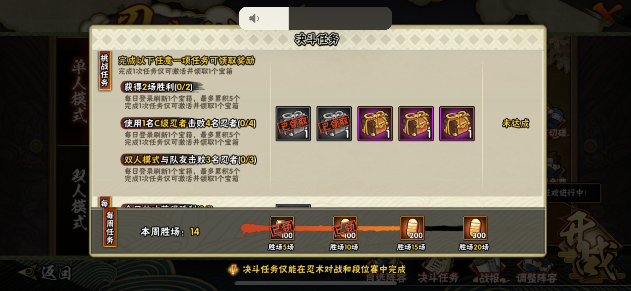 金币来源主要之一,也是这款游戏的核心,分为忍术对战和段位赛两种方式(其他模式有兴趣也可以试一试),累计对战5场获胜会有相应的奖励,胜利5场可获得决斗点券个人感觉用处不大(可以兑换决斗商店中的忍者以及密卷和通灵,当然都是有时间限制的),胜利10场可获得100金币、15场200金币、20场300金币,个人建议周一至周五日常任务只需要赢一场即可,周六至周日胜场翻倍也就是说胜利一场按胜利两场结算。
