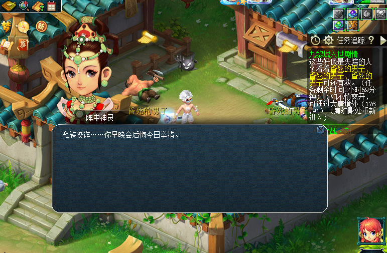 战斗胜利后,进入剧情动画。注意:3位昏死的NPC之中,有1位不是魔族,给其一份三药。之后对话,就会被传送到华丽天宫。
