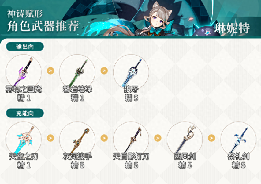 前两者均为五星输出单手剑,在琳妮特手上输出水平相仿,均大幅优于其他五星单手剑。但是限定五星实在太贵了QAQ狼牙则是纪行获取的大月卡新四星,有着相当不错的暴击率加成和战技大招增伤。同样只推荐氪佬考虑。✽ 天空之刃、灰河渡手、天目影打刀、西风剑、祭礼剑:这类武器以元素充能效率为主词条或具备能量回复效果,可以让琳妮特大招循环更加流畅,战斗手感更佳。但这类武器输出能力整体比双暴武器更差,输出向琳妮特还是以选择双暴武器更优。