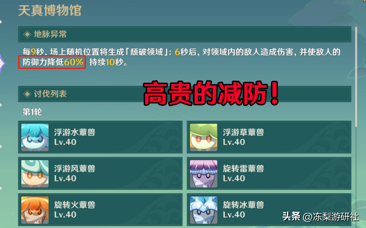 这次活动「蔷薇再开时」就是极佳的核爆场地,方便不少。第二关“天真博物馆”,周期性生成颓破领域降低敌人60%防御力,若你配队中不存在减防类角色,那么为你带来的最终伤害实际增幅约为43%(原本100万,那现在就是143万)。魔物水火冰三种都有,可以配队省去这个格子靠风系扩对应元素染色作反应基底。