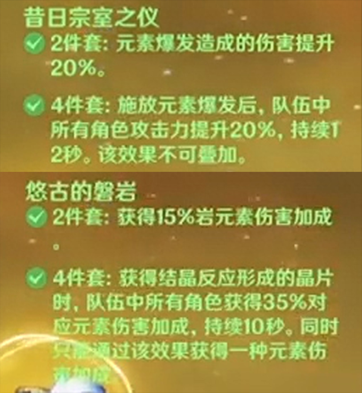 作为辅助的话,推荐4宗室或是4攀岩,根据队伍中的角色灵活搭配。充能沙、精通杯、治疗头,保证辅助能力的最大化。