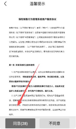 2、完整的阅读保险销售行为管理系统用户服务协议,并点击同意进入。