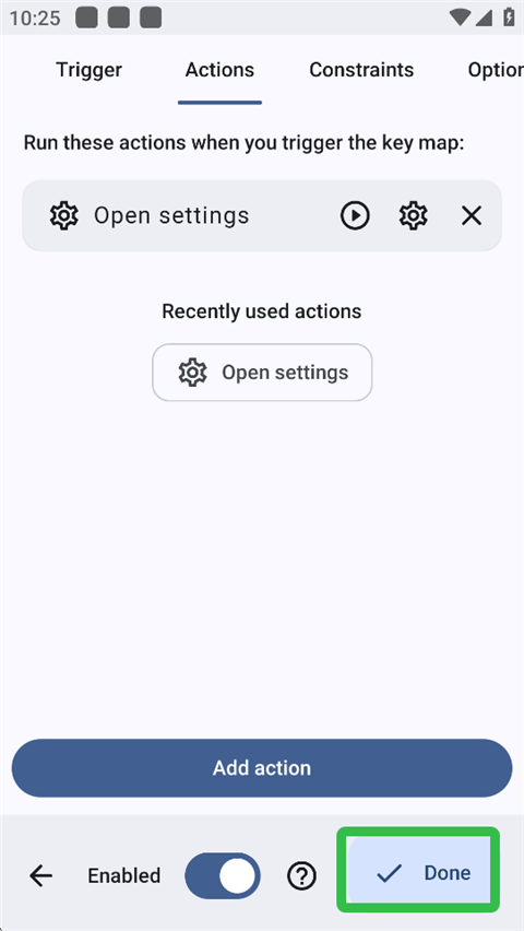 您可以组合来自特定设备或任何设备的多个键以形成“触发器”。每个触发器可以有多个动作。按键可设置为同时按下或依次按下。短按、长按或双击时可以重新映射按键。键盘映射可以具有一组“约束”,因此它仅在某些情况下有效。
