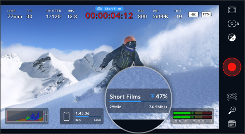 当您向Blackmagic Cloud上传素材时,上传指示器将显示片段名称、上传速度、已上传进度百分比以及剩余完成时间。