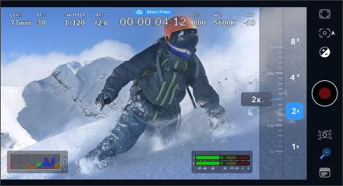 录制按钮用于启动/停止录制。轻触一次开始录制,再次轻触结束录制。录制时屏幕顶部的按钮和时间码将变为红色。