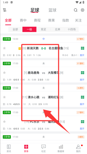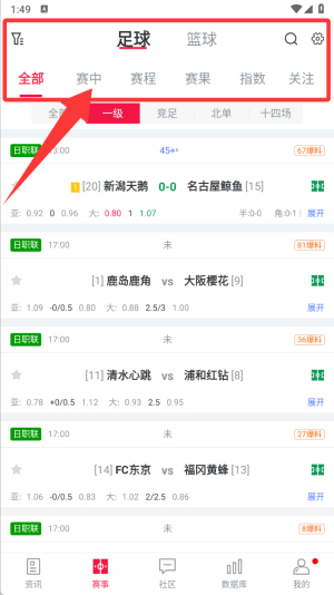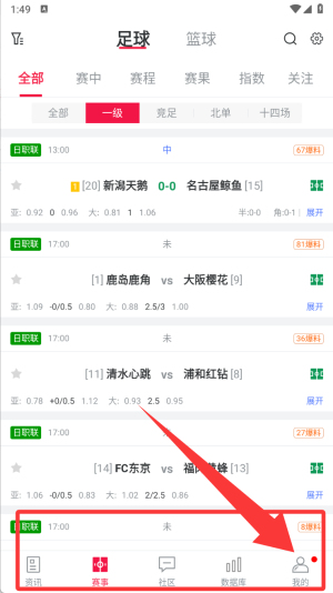 1、打开足球财富app,找到赛事按钮并点击进入。