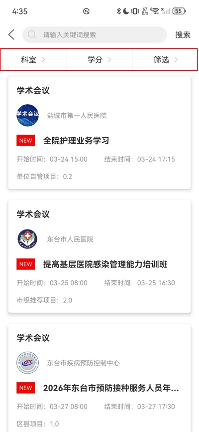 2、找到要参加的会议并点击,可通过科室、学分、筛选进行会议选择;