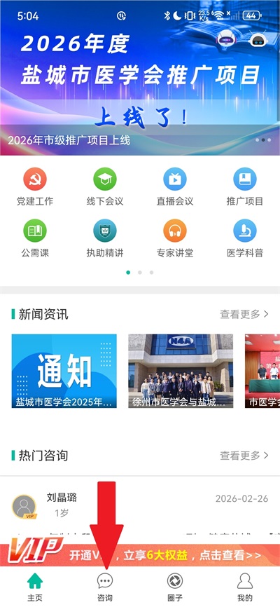 1、打开"健康盐城APP"进入首页,在底部导航栏中点击"咨询"进入该页面;