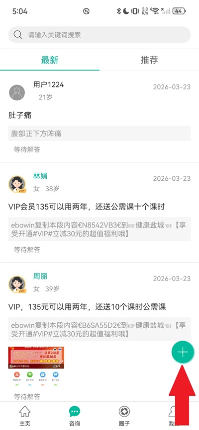 2、在"咨询"页面中,点击右下方绿色加号图标;