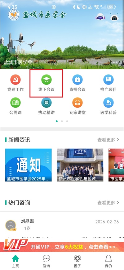 1、打开"健康盐城"APP,在首页中找到"线下会议"并点击;