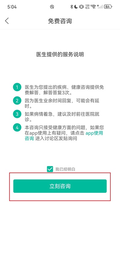 3、点击该图标会自动跳转"医生提供的服务说明",点击下方"立刻咨询";