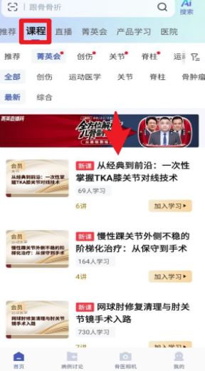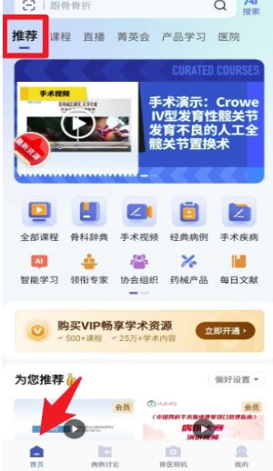 1、打开应用进入首页,在底部点击「首页」按钮,可以浏览推荐课程、手术视频和学术资讯,轻松找到最新学习内容。