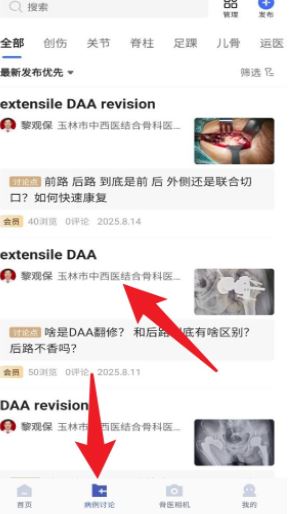 3、点击底部导航栏的「病例讨论」按钮,可以浏览其他医生上传的真实病例,并在列表中选择感兴趣的讨论。