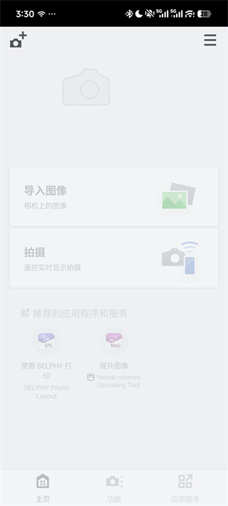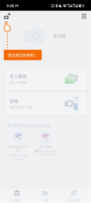 4、配对成功后,App 首页会显示已注册的相机,「导入图像」「拍摄」等功能将从灰色变为可点击状态,连接完成。