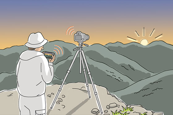 在相机上设好Av(光圈优先自动曝光)、Tv(快门优先自动曝光)、P(程序自动曝光)、M(手动曝光)等拍摄模式后,就可以在智能手机的画面上设置光圈值、快门速度、ISO感光度、曝光补偿、白平衡等多种拍摄设置。因为智能手机和相机可以通过Wi-Fi直连,在山顶、海上等多种环境中都可以使用。