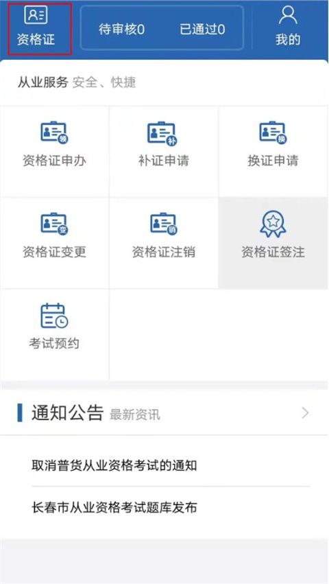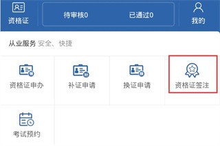 3、在主页面左上角点击“资格证”追加资格证,审核通过后返回主页面,点击“资格证签注”进行业务办理;