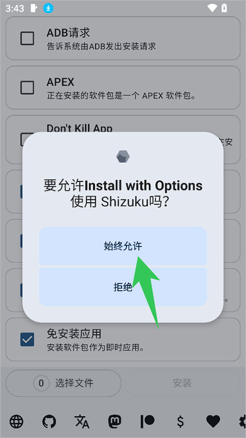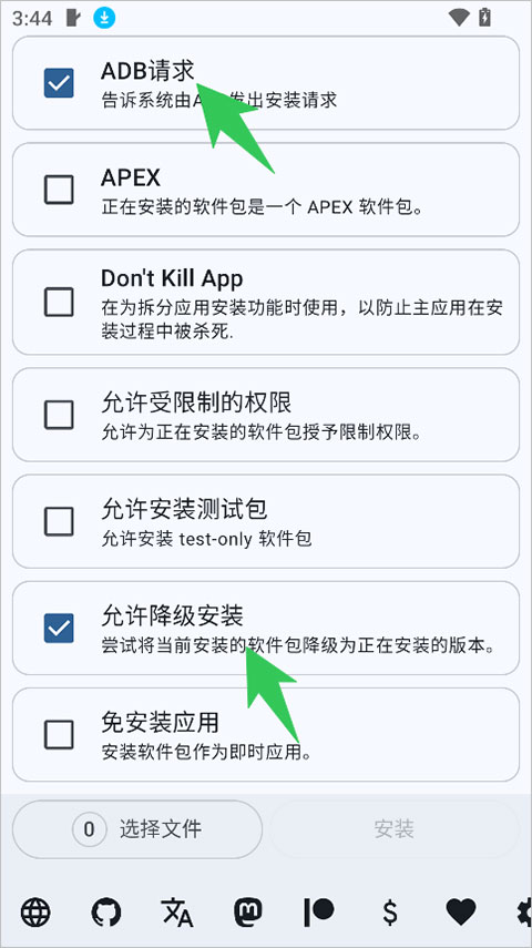 它本质上是将 `adb install` 的各种复杂参数(如 `-r`, `-t`, `-g` 等)图形化。借助Shizuku框架,用户无需连接 PC 运行命令行,在手机端勾选开关即可获得高级权限。