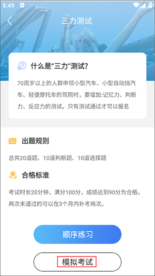 3、在三力测试的界面上点击“模拟考试”