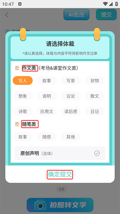 3、编辑好作文内容后点击右上角提交,选择好作文体裁,点击确认提交;
