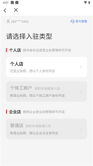 3、选择您的入驻类型;