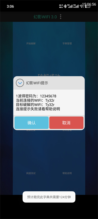 5、破解成功后会弹出提示,显示获取到的 WiFi 密码、当前 / 目标 WiFi 信息,同时标注预计跑完全部字典的时长,点击「确认」完成操作。