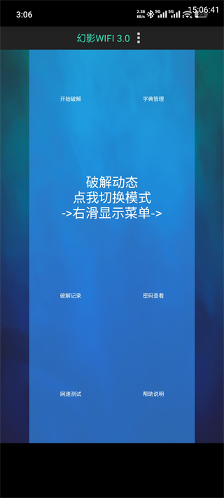 2、主界面核心功能区,可点击「开始破解」发起破解,支持右滑唤出菜单、切换模式,还可查看破解记录、密码、测速及帮助说明。